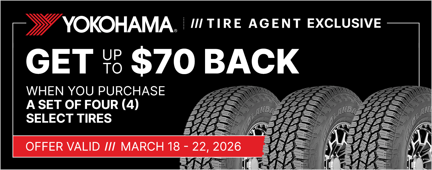 Offer valid for residents of the United States (excluding Hawaii and Alaska) only. Purchase must be completed between 03/18/2026 and 03/22/2026. Limit of one (1) redemption request $70 Reward per purchase of four (4) select Yokohama tires.